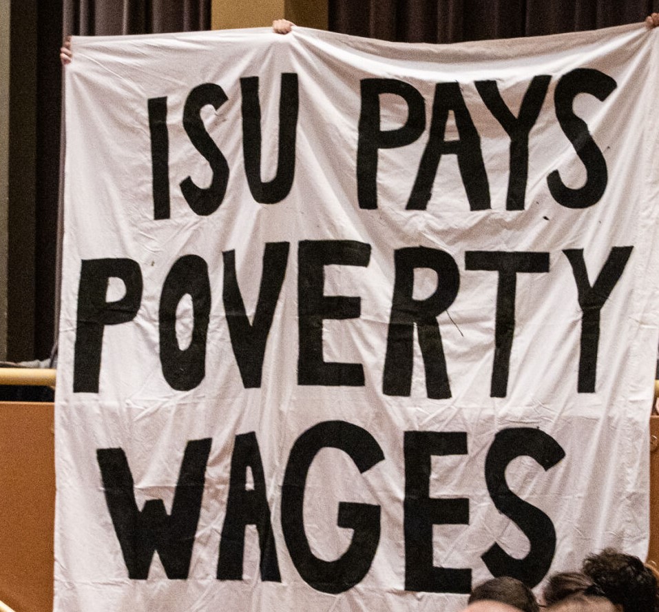 Around halfway through the state of the address, a handful of members of ISU’s graduate student worker union stood up from the crowd and held up a banner reading, “ISU pays poverty wages”. The state of the address continued without interruption, but the banner was held up high throughout the entire remaining fifteen minutes of the event.