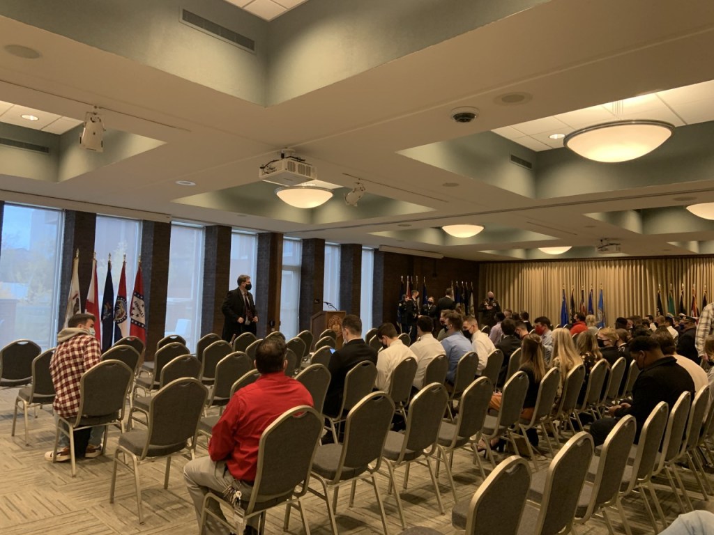 The ceremony began at noon on Thursday in the Prairie Room of the Bone Student Center and featured guest speaker retired Lt. Col. John Cross. Cross also served as the program director and as a professor for military science.